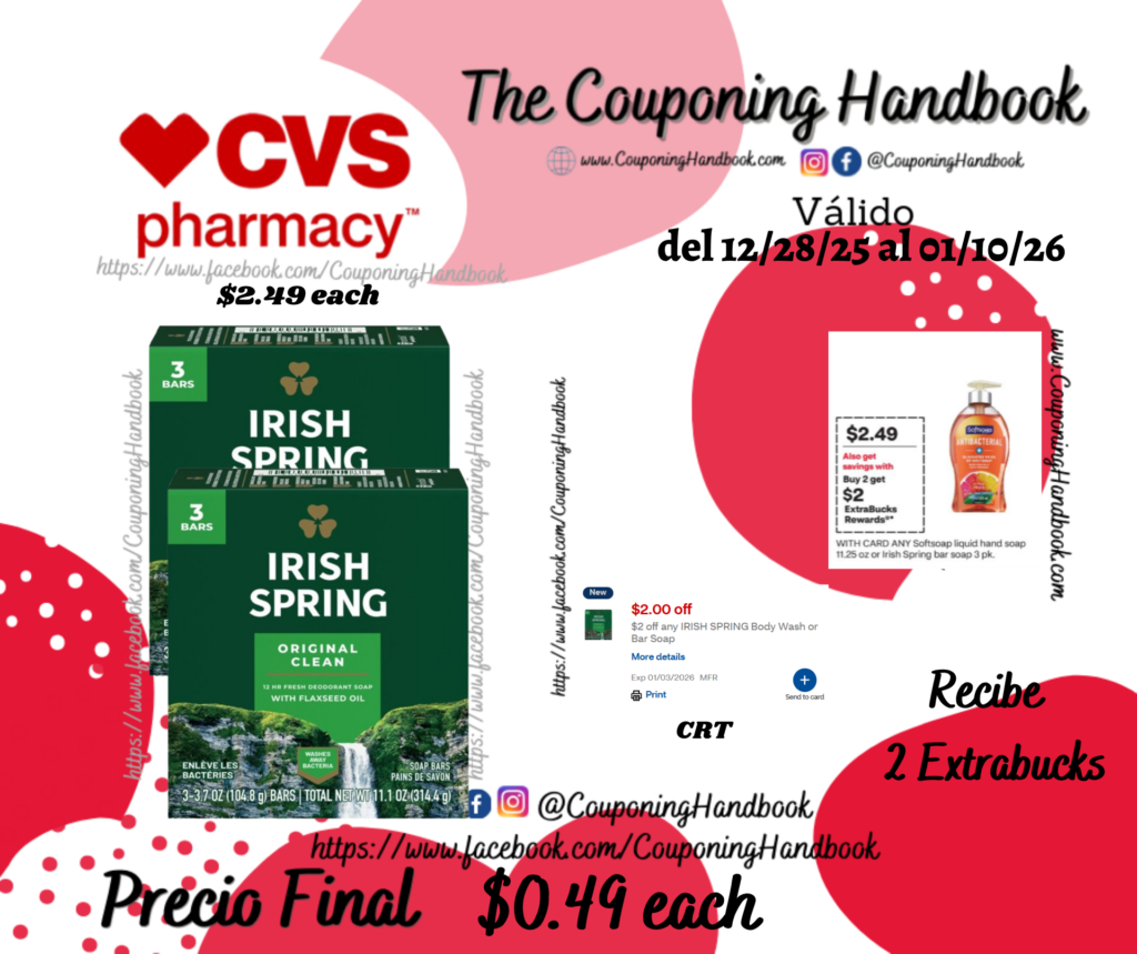 Irish Spring Bar Soap, 3/Pack por $0.49 por Mery Cardoso el diciembre 30, 2025 con No hay comentarios CVS Compra 02 Irish Spring Bar Soap, 3/Pack ($2.49 each), clipeamos el CRT de $2 off any irish spring body wash or bar soap….; pagaremos $2.98 por los 02 productos pero nos devolverán $2 Extrabucks, quedando la compra en $0.49 por cada producto. Comparte:FacebookTwitter