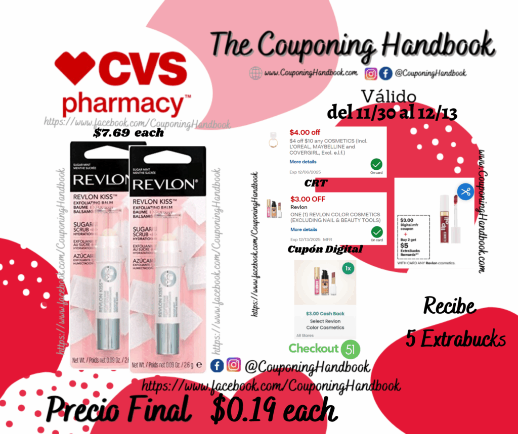 Compra 02 Lip Balm & Treatments Revlon Kiss Exfoliating Balm Sugar Mint ($7.69 each), clipeamos el CRT de $4 off $10 any COSMETICS (Incl. L’OREAL, MAYBELLINE and COVERGIRL, Excl. e.l.f.)…., también clipeamos el cupón digital de $3/1 REVLON COLOR COSMETICS (EXCLUDING NAIL & BEAUTY TOOLS)….; pagarás $8.38 pero nos devolverán $5 Extrabucks por comprar 02 productos, quedando tu compra después de los extrabucks en $8.38 por los 02 productos.