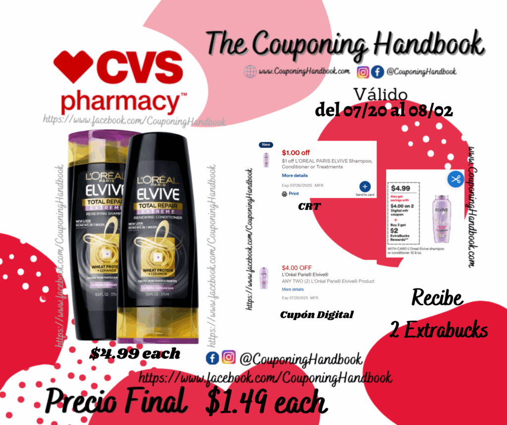 Compra 02 L’Oreal Paris Elvive Total Shampoo or conditioner ($4.99 each), clipeamos el CRT de $1 off any L’OREAL PARIS ELVIVE Shampoo, Conditioner or Treatments…, también clipeamos el cupón digital de $4/2 any L’Oréal Paris® Elvive® Product….; pagaremos $4.98 por los 02 productos pero nos devolverán $2 Extrabucks, quedando nuestra compra después de los extrabucks en $1.49 por cada producto.