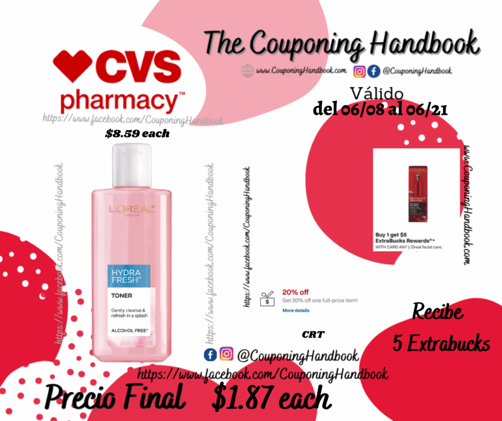 Toma 01 L’Oreal Paris HydraFresh Toner ($8.59 each), clipeamos o entregamos el CRT de 20% off one full price….; pagaremos $6.87 pero nos devolverán $5 extrabucks por comprar el producto, quedando la compra después de los Extrabucks en $1.87