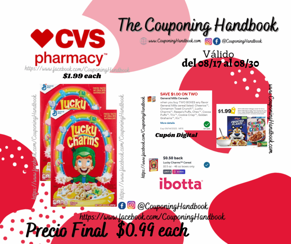 Toma 02 Lucky Charms Cereal 10.5 oz ($1.99 each), clipeamos el cupón digital de $1/2 General Mills Cereals……; Pagaremos $2.98 por los 02 productos.