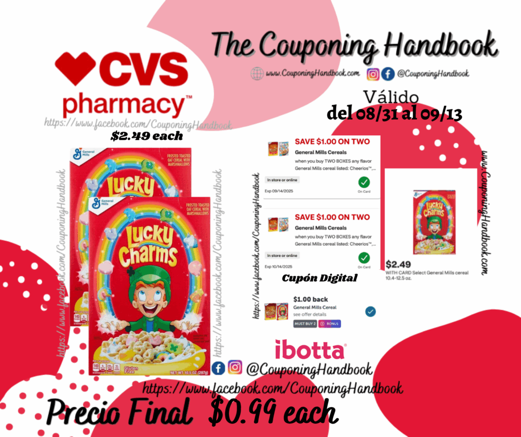 Toma 02 Lucky Charms Cereal 10.5 oz ($2.49 each), clipeamos los 02 cupones digitales de $1/2 General Mills Cereals……; Pagaremos $2.98 por los 02 productos.