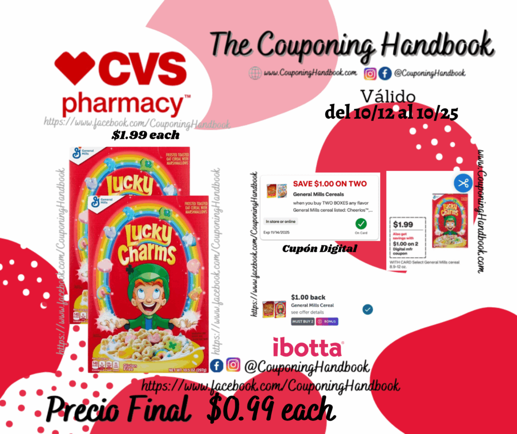 Toma 02 Lucky Charms Cereal 10.5 oz ($1.99 each), clipeamos el cupón digital de $1/2 General Mills Cereals……; Pagaremos $2.98 por los 02 productos.