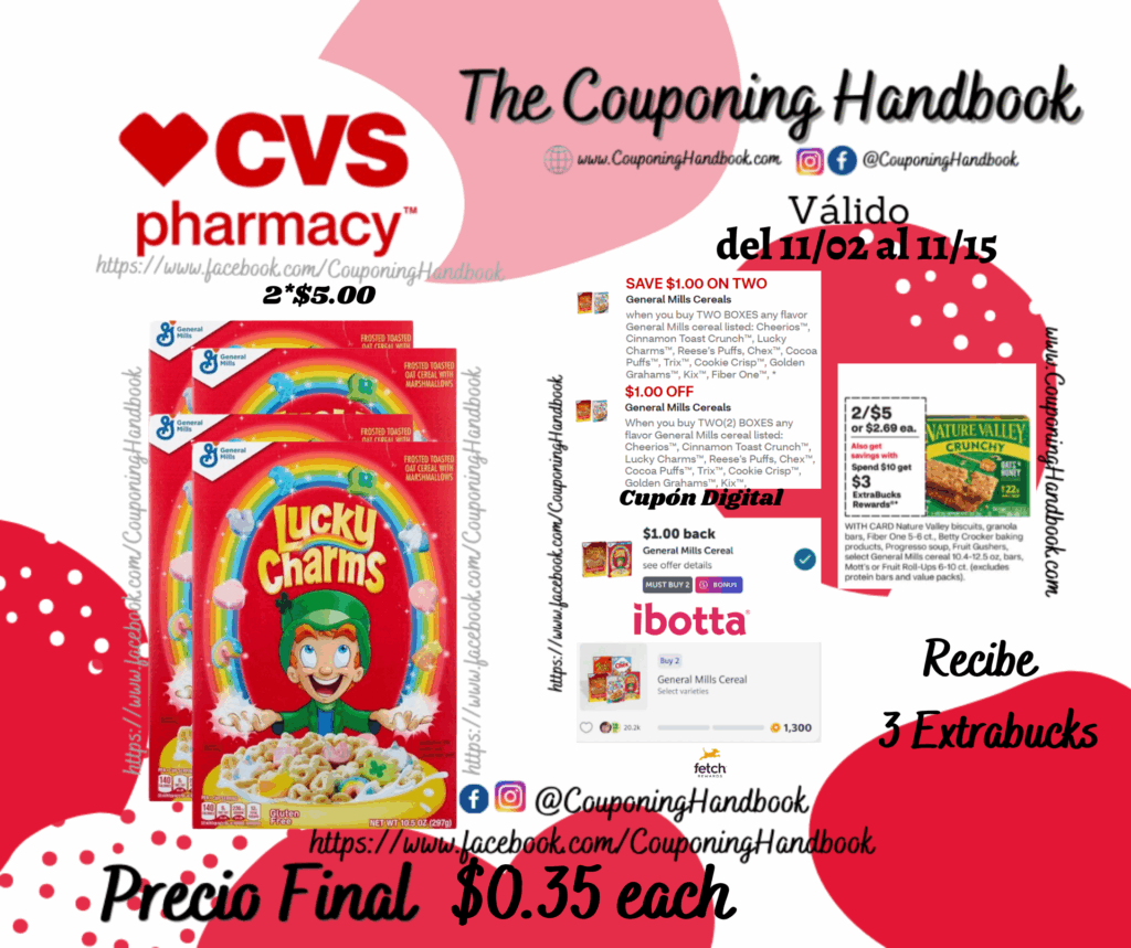 Toma 04 Lucky Charms Cereal 10.5 oz (2*$5.00), clipeamos los 02 cupones digitales de $1/2 General Mills Cereals……; Pagaremos $8.00 por los 04 productos pero nos devolverán $3 Extrabucks por gastar $10, quedando la compra en $5 por los 04 productos.