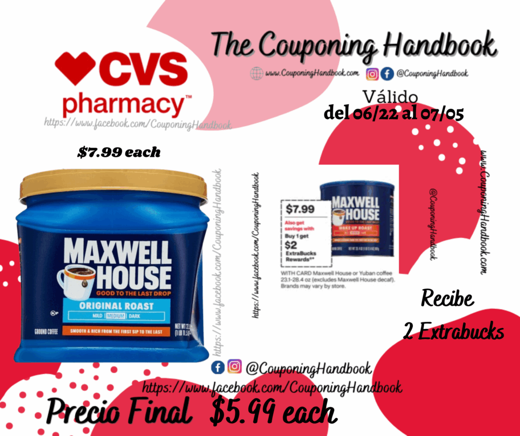 Maxwell House Original Roast Medium Ground Coffee, 27.50 oz por $5.99 por Mery Cardoso el junio 25, 2025 con No hay comentarios CVS Toma 02 Maxwell House Original Roast Medium Ground Coffee, 27.50 oz ($7.99 each)…; Pagaremos $7.99 por el producto pero nos devolverán $2 Extrabucks, quedando la compra después de los extrabucks en $5.99 por cada producto. Comparte:FacebookTwitter