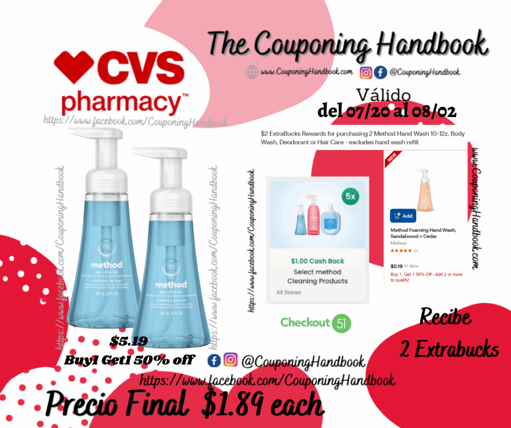 Compra 02 Method Foam Hand Wash, 10 OZ ($5.19 Buy1Gey1 50% off).…; pagaremos $7.78 pero te devolverán $2 Extrabucks, quedando nuestra compra en $5.78 por los 02 productos.