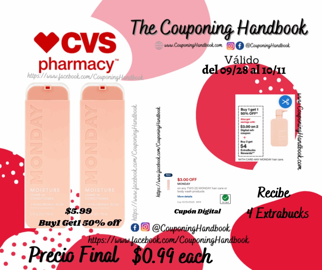 Compra 02 MONDAY Leave In Conditioner, 5 OZ ($5.99 Buy1 Get1 50% off), clipeamos el cupón digital de $3/2 MONDAY hair care or body wash products…; pagaremos $5.98 pero te devolverán $4 Extrabucks por comprar 02 productos, quedando la compra después de los Extrabucks en $0.99 por cada producto.