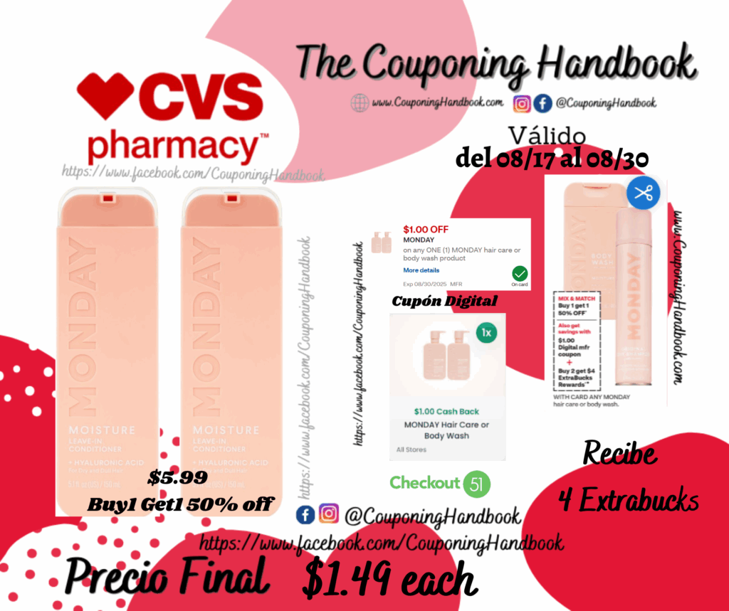Compra 02 MONDAY Leave In Conditioner, 5 OZ ($5.99 Buy1 Get1 50% off), clipeamos el cupón digital de $1/1 any MONDAY hair care or body wash product…; pagaremos $7.98 pero te devolverán $4 Extrabucks por comprar 02 productos, quedando la compra después de los Extrabucks en $3.98 por ambos productos.