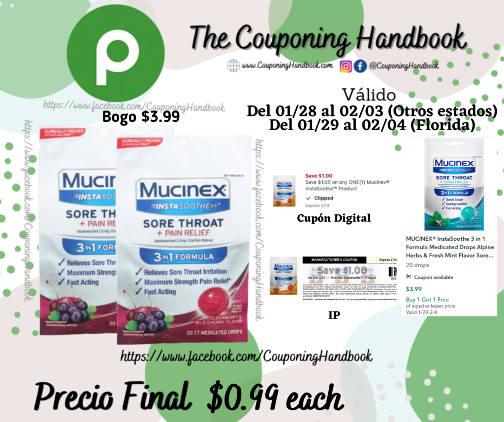 Compra 02 Mucinex InstaSoothe Sore Throat + Pain Relief, 3 in 1 Formula, Medicated Drops (Bogo $3.99), clipeamos el cupón digital de $1/1 any Mucinex® InstaSoothe™ Product……, adicionalmente entrega 01 IP de $1/1 any Mucinex® InstaSoothe™ Product…, el cual lo puedes imprimir ingresando al siguiente enlace