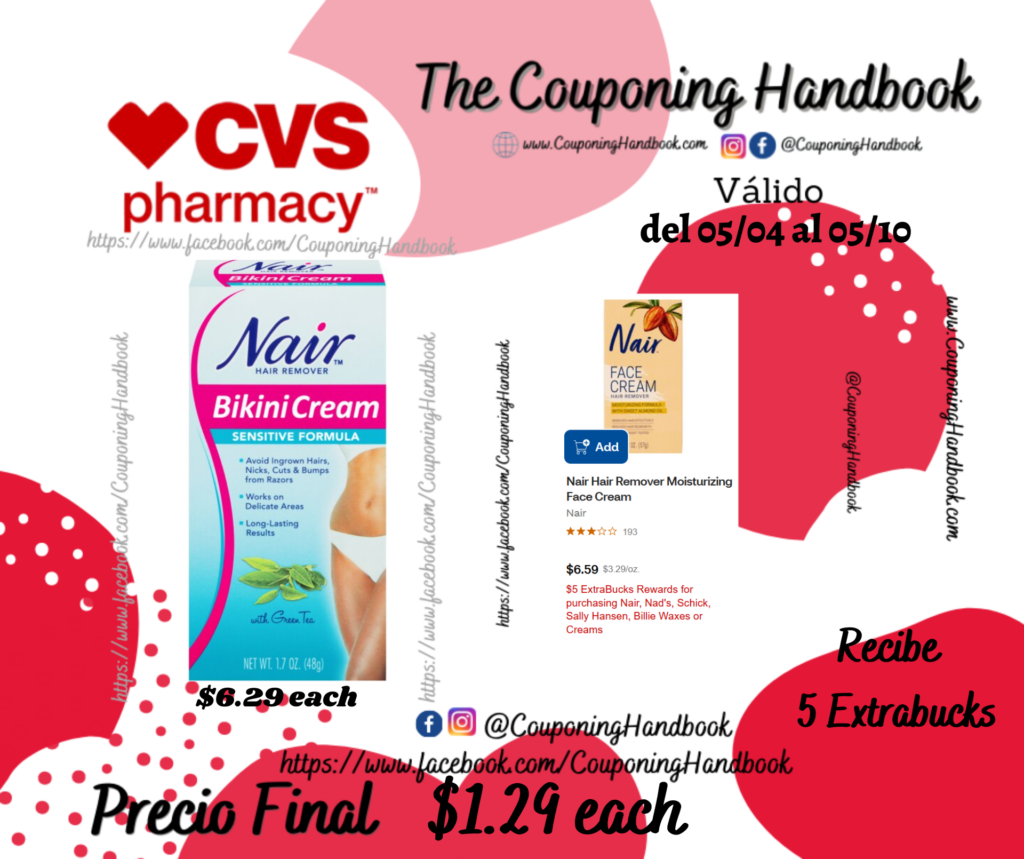 Toma 01 Nair Hair Remover Bikini Cream with Green Tea ($6.29 each).….; pagaremos $6.29 por el producto pero nos devolverán $5 Extrabucks, quedando el producto por $1.29
