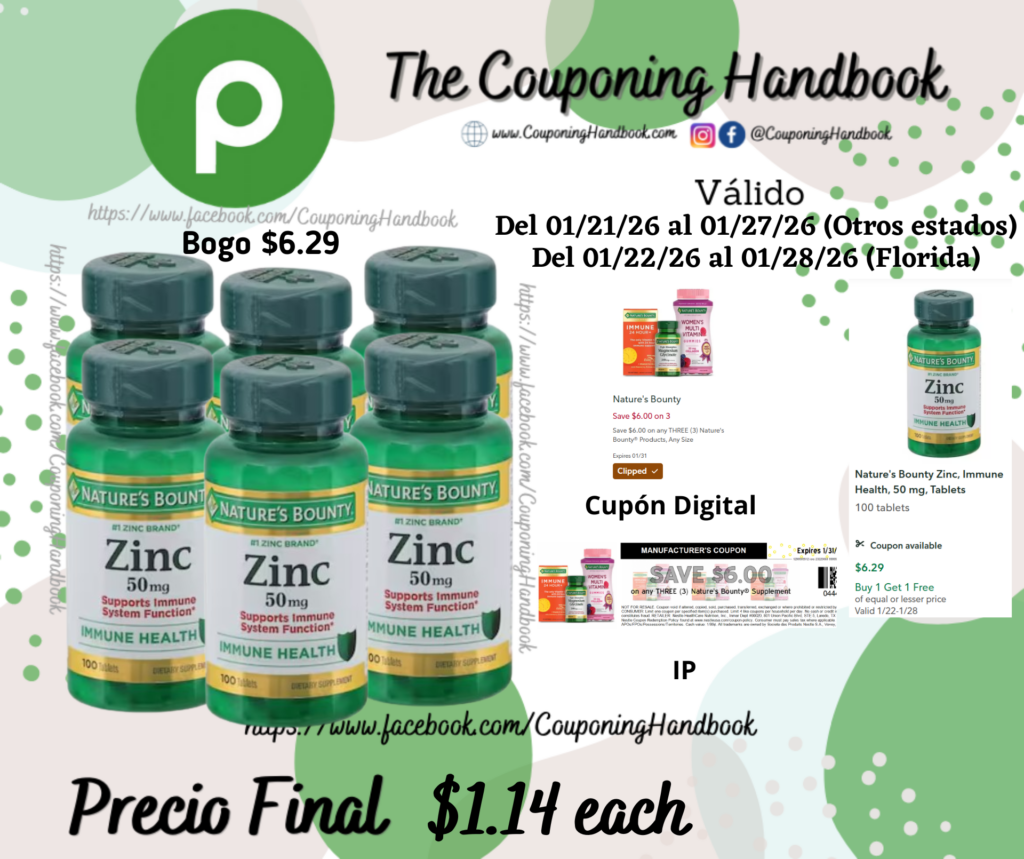 Compra 06 Nature’s Bounty Zinc, Immune Health, 50 mg, Tablets 100 tablets (Bogo $6.29), clipeamos el cupón digital de $6/3 any Nature’s Bounty® Products, Any Size…, y también entregamos un cupón IP de $6/3 any nature’s bounty Productd…., el cual lo puedes imprimir  en el siguiente enlace 👉👉👉👉 (Nature’sBounty)… .; pagaremos $6.87 por los 06 productos o $1.14 por cada producto.