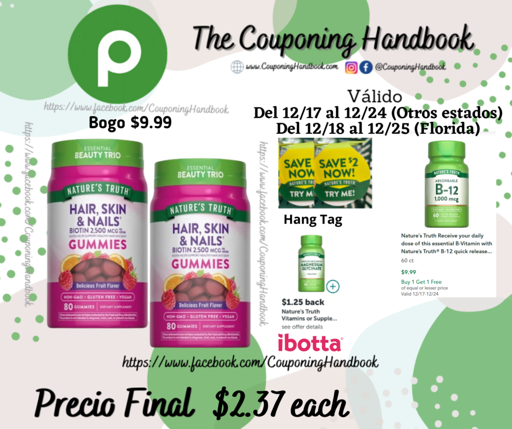 Compra 02 Nature’s Truth Nature’s Truth Hair Skin Nails Gummies 80 (Bogo $9.99), entregamos 02 Hang Tag de $2/1 Nature’s Truth….(el cual se encuentra en el producto)..; pagarás $5.99 por ambos productos.