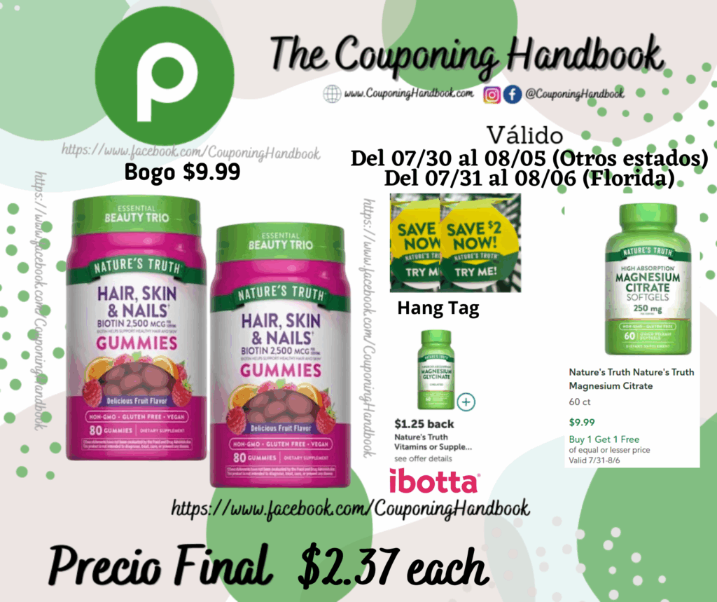 Compra 02 Nature’s Truth Nature’s Truth Hair Skin Nails Gummies 80 (Bogo $9.99), entregamos 02 Hang Tag de $2/1 Nature’s Truth….(el cual se encuentra en el producto)..; pagarás $5.99 por ambos productos.