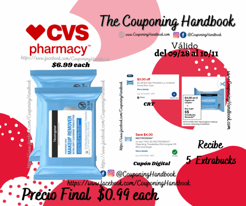Toma 02 Neutrogena Makeup Remover Cleansing Towelettes, 25CT ($6.99 each), clipeamos o entregamos el CRT de $3 off $10 NEUTROGENA or AVEENO Facial Skin Care…., también clipeamos el cupón digital de $4/2 any NEUTROGENA® Cleansing Towelettes 20ct singles OR 25ct and larger…; Pagaremos $6.98 pero nos devolverán $5 extrabucks por comprar 2 productos, quedando la compra después de los extrabucks en $0.99 por cada producto.