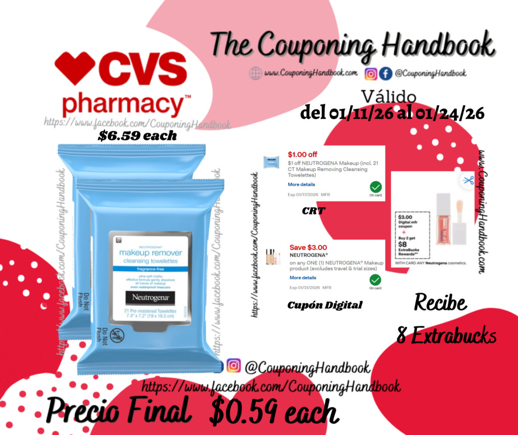 Compra 02 Neutrogena Makeup Remover Facial Cleansing Towelettes & Wipes, 21CT ($6.59 each), clipeamos el CRT de $1 off NEUTROGENA Makeup (incl. 21 CT Makeup Removing Cleansing Towelettes)...., también clipeamos el cupón digital de $3/1 any NEUTROGENA® Makeup product (excludes travel & trial sizes).…; pagarás $9.18 por los 02 productos pero nos devolverán $8 Extrabucks por comprar 02 productos, quedando la compra en $1.09 por cada producto.