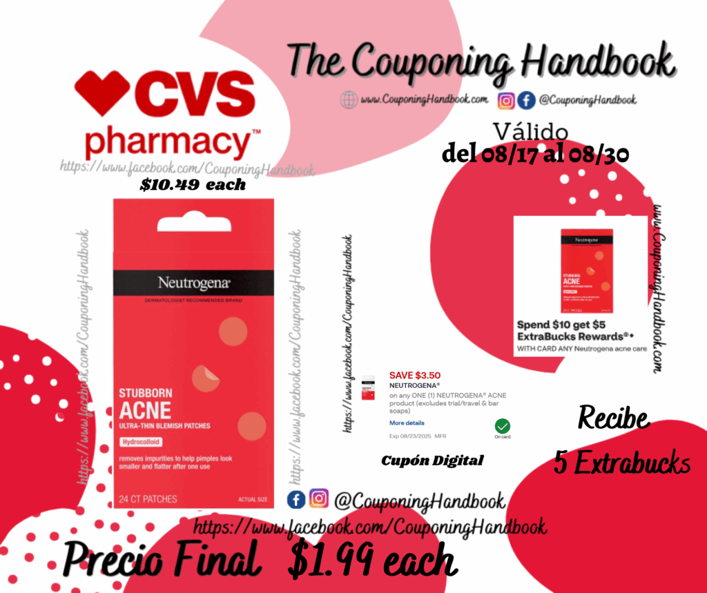 Toma 01 Neutrogena Stubborn Acne Hydrocolloid Blemish Patches ($10.49 each), clipeamos el cupón digital de $3.5/1 any NEUTROGENA® ACNE product (excludes trial/travel & bar soaps)….; pagaremos $6.99 pero nos devolverán $5 extrabucks por gastar $10 en productos, quedando la compra en $1.99 por el producto.