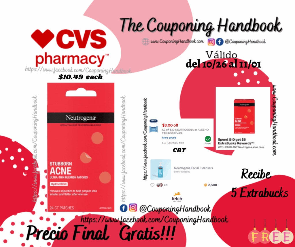 Toma 01 Neutrogena Stubborn Acne Hydrocolloid Blemish Patches ($10.49 each), clipeamos o entregamos el CRT de $3 off $10 NEUTROGENA or AVEENO Facial Skin Care…..; pagaremos $7.49 pero nos devolverán $5 extrabucks por gastar $10 en productos, quedando la compra en $2.49 por el producto.