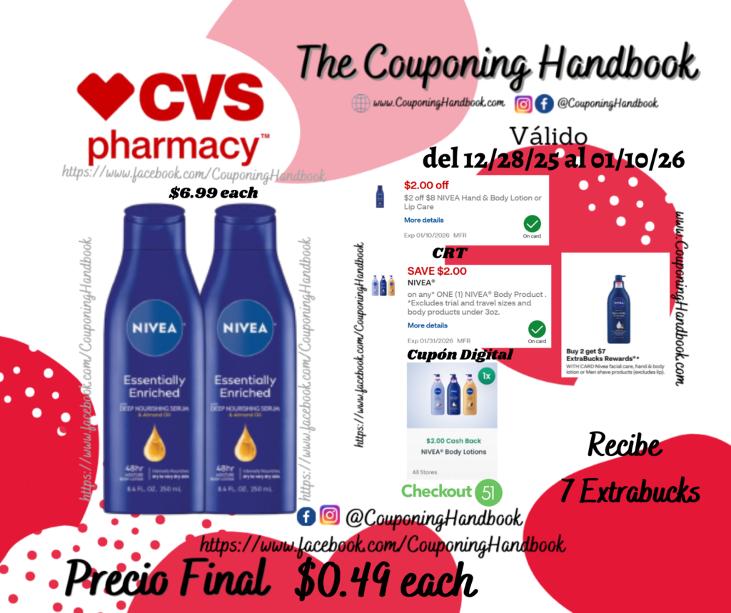 Compra 02 NIVEA Essentially Enriched Body Lotion, 8.4 OZ ($6.99 each), clipeamos los CRT de $2 off $8 NIVEA Hand & Body Lotion or Lip Care…., también clipeamos el cupón digital de $2/1 any NIVEA® Body Product *Excludes trial and travel sizes and body products under 3oz…..; Pagaremos $9.98 por los 02 productos pero nos regresaran $7extrabucks, quedando la compra después de los extrabucks en $2.98 por ambos productos.