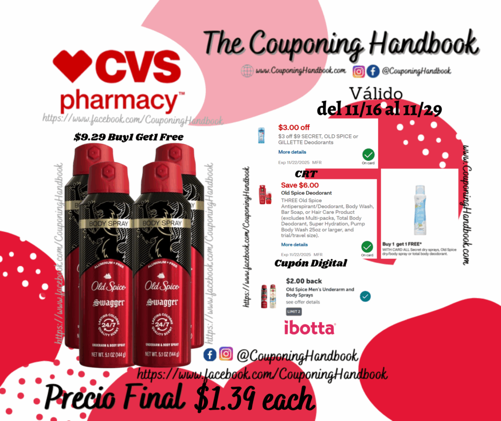 Compra 04 Old Spice Underarm & Body Body Spray, Swagger, 5.1 OZ ($9.29 Buy1 Get1 Free), clipeamos el CRT de $3 off $9 SECRET, OLD SPICE or GILLETTE Deodorants…, también clipeamos el cupón digital de $6/3 Old Spice Antiperspirant/Deodorant, Body Wash, Bar Soap, or Hair Care Product…..; pagaremos $9.58 por los 04 productos.