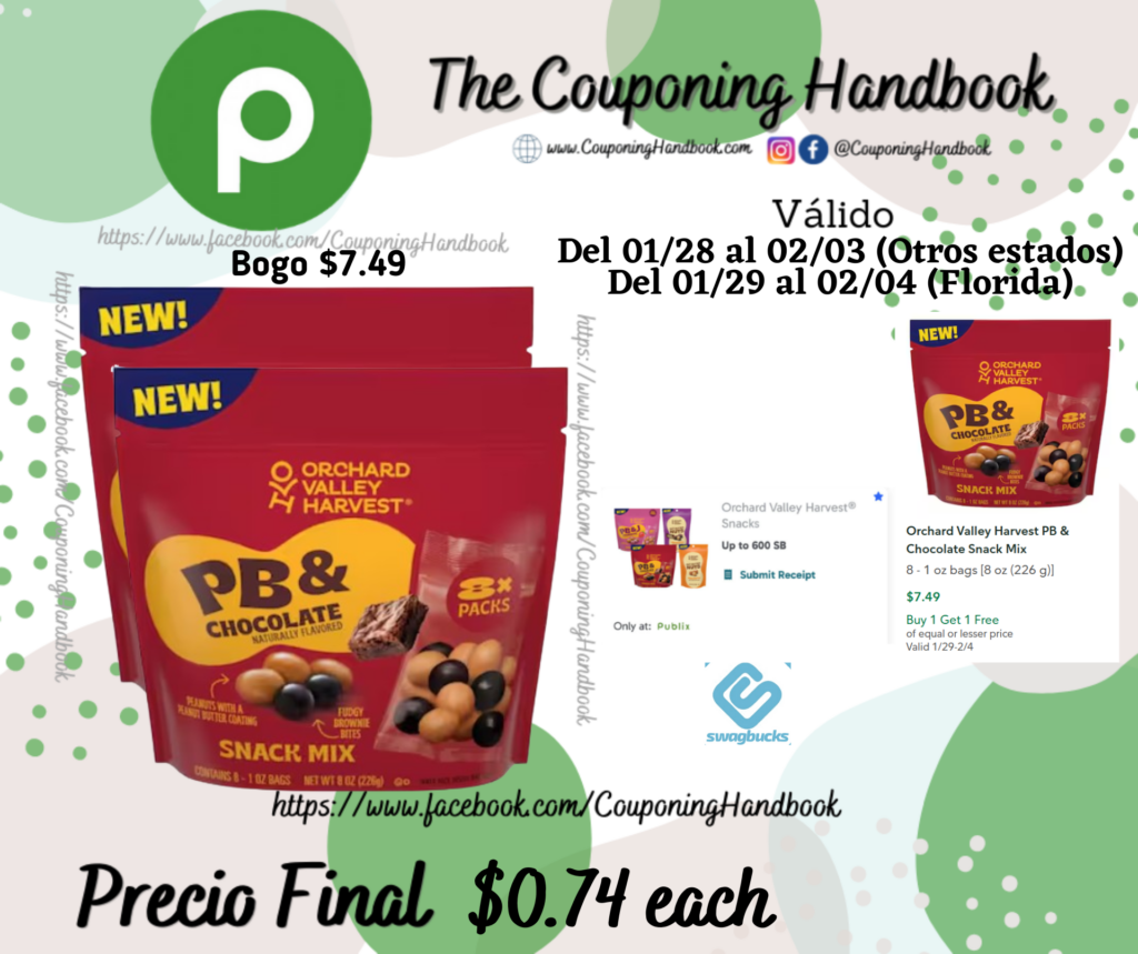 Compra 02 Orchard Valley Harvest PB & Chocolate Snack Mix (Bogo $7.49)…..; pagarás $7.49 por los 02 productos.