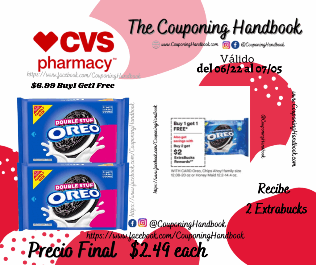 OREO, Double Stuf Chocolate Sandwich Cookies, Family Size, 18.71 oz por $2.49 por Mery Cardoso el julio 2, 2025 con No hay comentarios CVS Compra 02 OREO, Double Stuf Chocolate Sandwich Cookies, Family Size, 18.71 oz ($6.99 Buy1 Get1 Free)..; pagaremos $6.99 por los 02 productos pero nos devolverán $2 Extrabucks, quedando la compra en $2.49 por cada producto. Comparte:FacebookTwitter