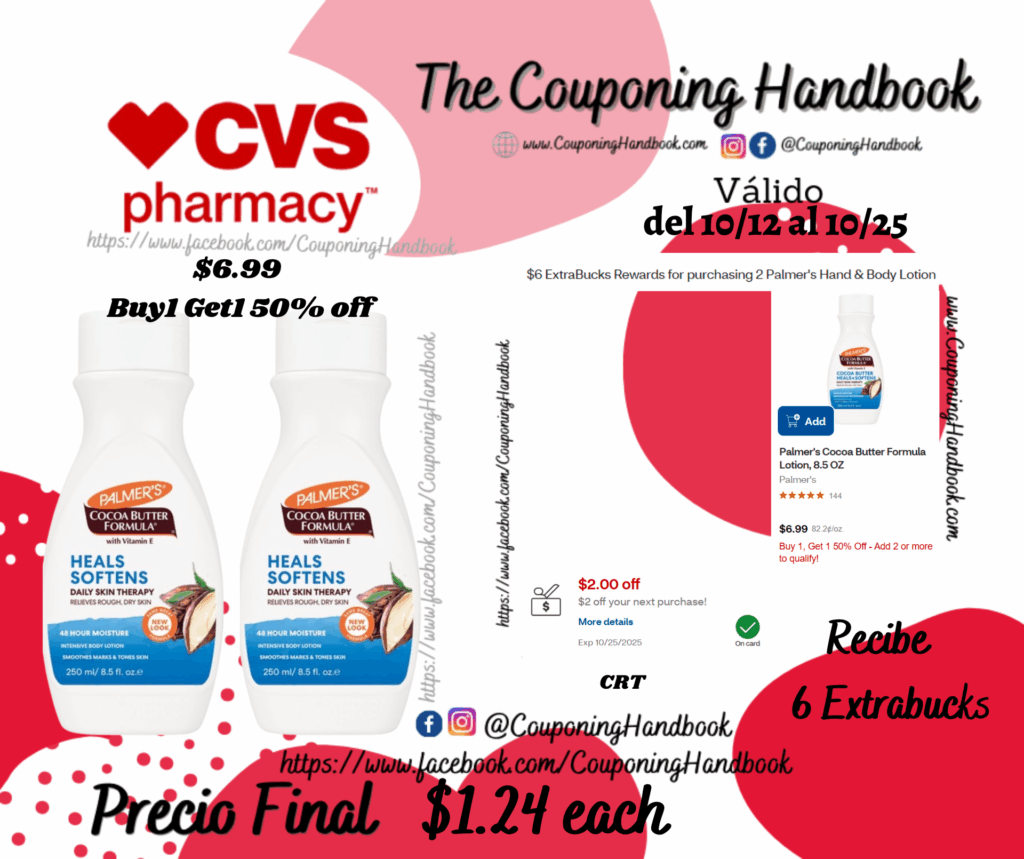 Compra 02 Palmer’s Cocoa Butter Formula Lotion, 8.5 OZ ($6.99 Buy1 Get1 50% off), clipeamos el CRT $2 off your next purchase!…..; pagaremos $8.48 por ambos productos pero nos regresarán $6 extrabucks, quedando nuestra compra en $1.24 por cada producto.