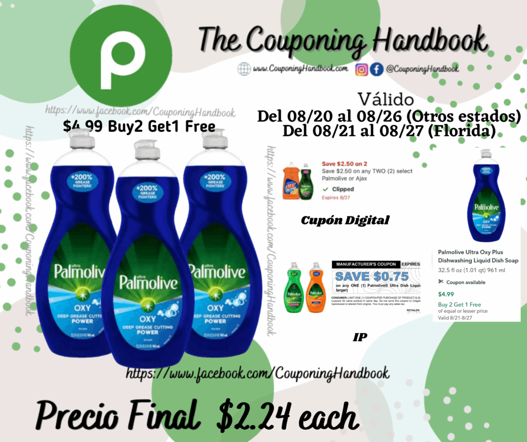 Compra 03 Palmolive Ultra Oxy Plus Dishwashing Liquid Dish Soap 32.5 fl ($4.99 Buy2 Get1 Free), clipeamos el cupón digital de $2.50/2 any select Palmolive or Ajax…., también entregamos 01 IP de $0.75/1 Palmolive Ultra Dish…, el cual lo puedes imprimir en el siguiente enlace