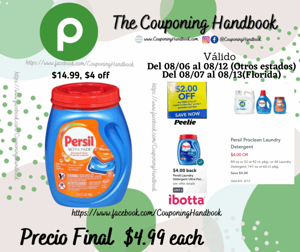 Compra 01 Persil Ultra Pacs Advanced Clean Detergent ($14.99 each, $4 off), entregamos 01 Peelie de $2/1 any persil liquid or pac…. (encontrado en el producto), adicionalmente la tienda te descontará $4 off por cada producto; pagaremos $8.99 por el producto.