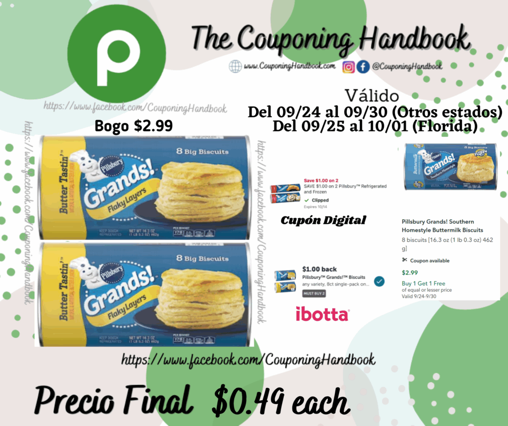Compra 02 Pillsbury Grands! Flaky Layers Butter Tastin’ Biscuits (Bogo $2.99), clipeamos el cupón digital de $1/2 Pillsbury™ Refrigerated and Frozen….; Pagaremos $1.99 por los 02 productos.