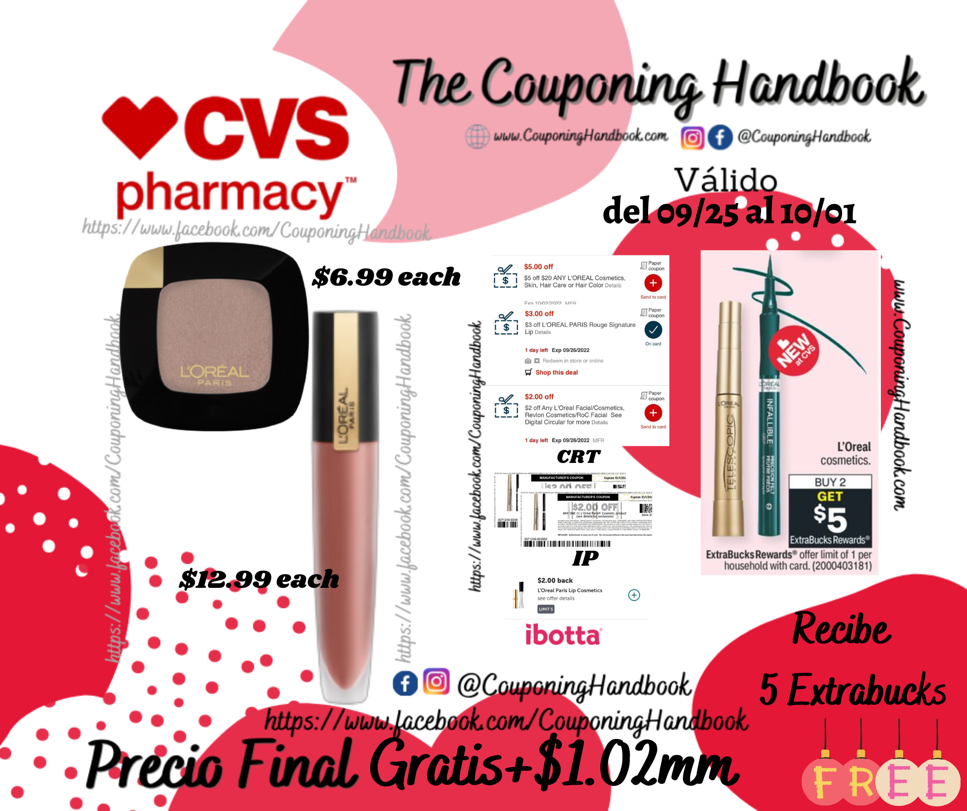 Compra 01 L’Oreal Paris Monos Eye Shadow ($6.99 each) y 01 L’Oreal Paris Rouge Signature Matte Lip Stain, High Pigment ($12.99 each), clipeamos o entregamos los CRT ‘s de: $5 off en $20 L’oreal Paris Cosmetics, skin…, $3 off L’oreal paris rouge signature lip y el de $2 off any L’oreal facial/cosmetics, adicionalmente entregamos 02 IP de $2/1 any L’oreal Paris cosmetics products; pagaremos $5.98; pero te devolverán $5 Extrabucks, quedando tu compra en $0.98 por ambos productos o $0.49 cada uno después de los extrabucks.