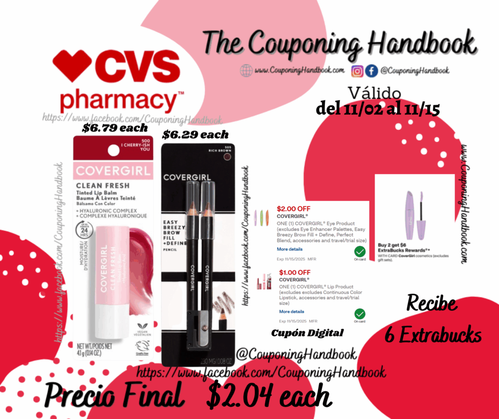 Toma 01 CoverGirl Brow & Eyemakers Eyeliner ($6.29 each) y 01 CoverGirl Clean Fresh Tinted Lip Balm, Made For Peach ($6.79 each), clipeamos los cupones digitales de: $2/1 COVERGIRL® Eye Product… y $1/1 COVERGIRL® Lip Product…; pagaremos $10.08 pero nos devolverán $6 extrabucks por comprar 2 productos, quedando la compra en $2.04 por cada producto.