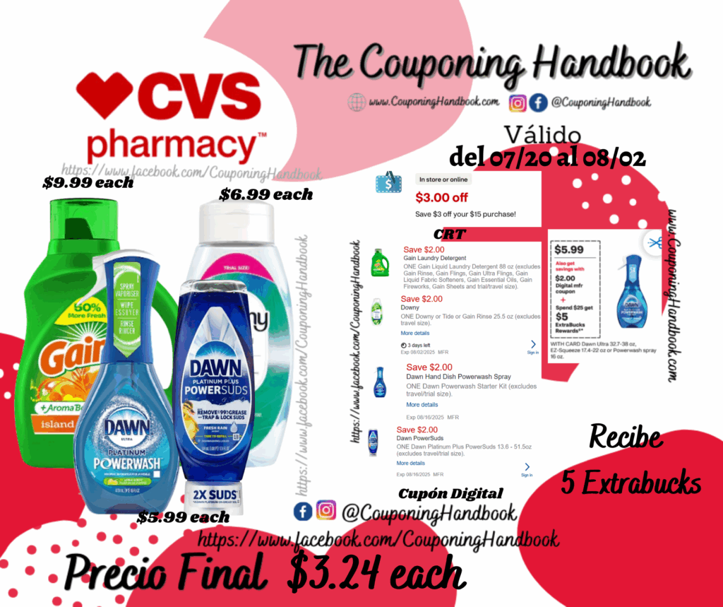 Compra 01 Gain Liquid Laundry Detergent ($9.99 each), 01 Downy Rinse & Refresh Fabric Rinse ($6.99 each), 01 Dawn Platinum Powerwash Dish Spray, Dish Soap ($5.99 each) y 01 ($7.99 Buy1 Get1 50% off), clipeamos el CRT de $3 off your $15 purchase…., también clipeamos los cupones digitales de: $2/1 Downy or Tide or Gain Rinse 25.5 oz (excludes travel size)…., $2/1 gain laundry detergent…, $2/1 Dawn Powerwash Starter Kit (excludes travel/trial size)…. y $2/1 Dawn Platinum Plus PowerSuds 13.6 – 51.5oz (excludes travel/trial size)….; Pagarás $17.96 pero nos devolverán $5 extrabucks por gastar $25 en productos, quedando la compra después de los extrabucks en $3.24 por cada producto.