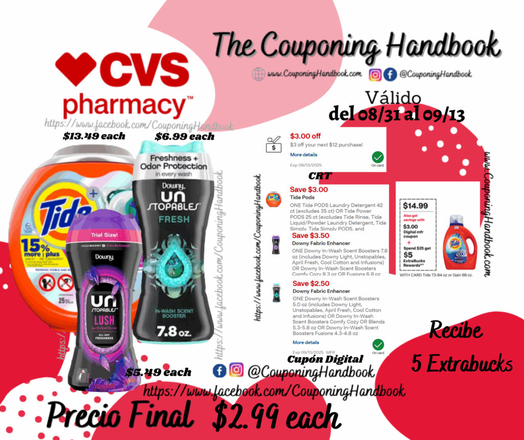 Compra 01 Tide + Power PODS Laundry Detergent Pacs, Spring Meadow, 25 ct ($13.49 each), 01 Downy Unstopables In-Wash Scent Booster, Fresh, 7.8 Ounces ($6.99 each) y 01 Downy Unstopables In-Wash Scent Booster Beads, Lush, 5 oz ($5.9 each), clipeamos el CRT de $3 off your $12 purchase…., también clipeamos los cupones digitales de: $3/1 Tide PODS Laundry Detergent 42 ct (excludes 35 ct) OR Tide Power PODS 25 ct …., $3.50/1 Downy In-Wash Scent Boosters 7.8 oz (includes Downy Light, Unstopables, April Fresh, Cool Cotton and Infusions) … y $2.50/1 Downy In-Wash Scent Boosters 5.0 oz (includes Downy Light, Unstopables, April Fresh, Cool Cotton and Infusions) OR Downy In-Wash Scent Boosters Comfy Cozy….; Pagarás $13.97 pero nos devolverán $5 extrabucks por gastar $25 en productos, quedando la compra después de los extrabucks en $2.99 por cada producto.