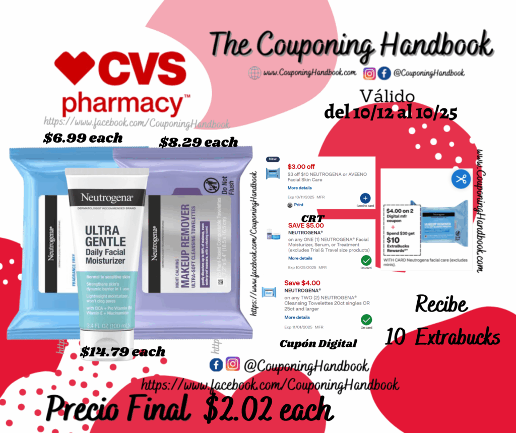 Toma 01 Neutrogena Makeup Remover Cleansing Towelettes, 25CT ($6.99 each), 01 Neutrogena Makeup Remover Night Calming Cleansing Face Wipes, 25CT ($8.29 each) y 01 Neutrogena Daily Facial Moisturizer ($14.79 each), clipeamos o entregamos el CRT de $5 off $20 NEUTROGENA or AVEENO Facial Skin Care…., también clipeamos los cupones digitales de: $5/1 NEUTROGENA® Facial Moisturizer, Serum, or Treatment… y $4/2 any NEUTROGENA® Cleansing Towelettes 20ct singles OR 25ct and larger…; Pagaremos $16.07 pero nos devolverán $10 extrabucks por gastar $30 en productos, quedando la compra después de los extrabucks en $2.02 por cada producto.