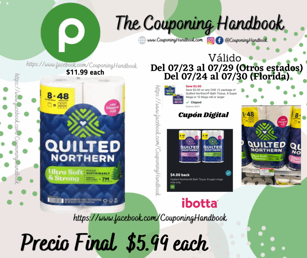 Compra 01 Quilted Northern Bathroom Tissue, Unscented, Ultra Soft & Strong ($11.99 each), clipeamos el cupón digital de $2/1 any package of Quilted Northern ® Bath Tissue, 8 Super Mega Rolls…..; pagaremos $9.99 por el producto.