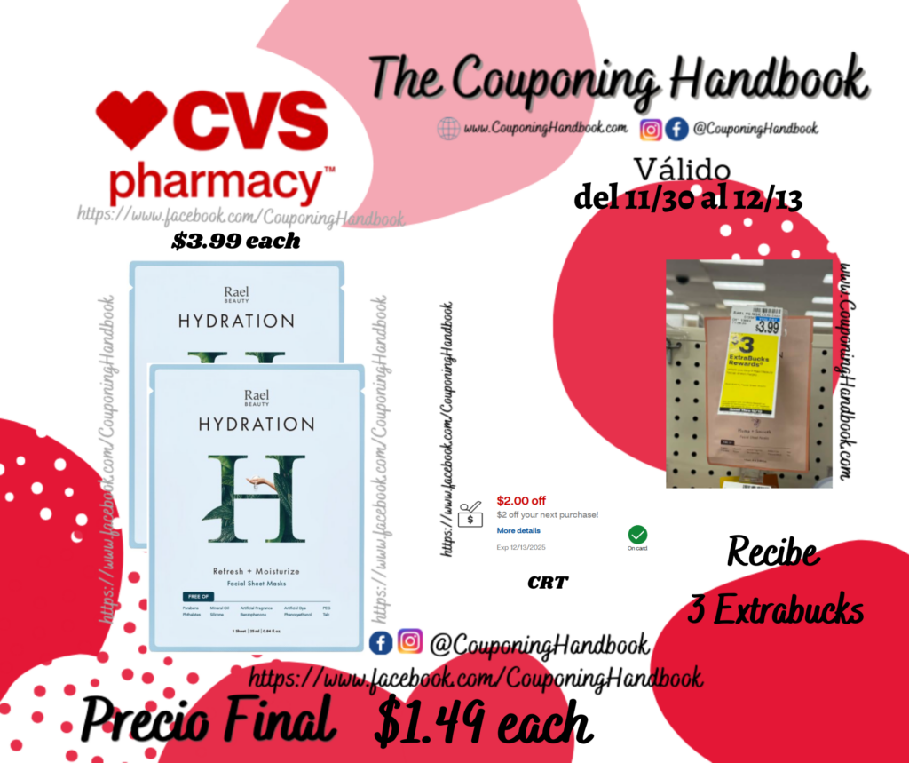 Compra 02 Rael Beauty Moisturizing Hydration Sheet Mask ($3.99 each), clipeamos el CRT de $2 off your next purchase!....; pagaremos $5.98 pero te devolverán $3 Extrabucks por comprar 02 productos, quedando tu compra después de los extrabucks en $1.49 por cada producto.