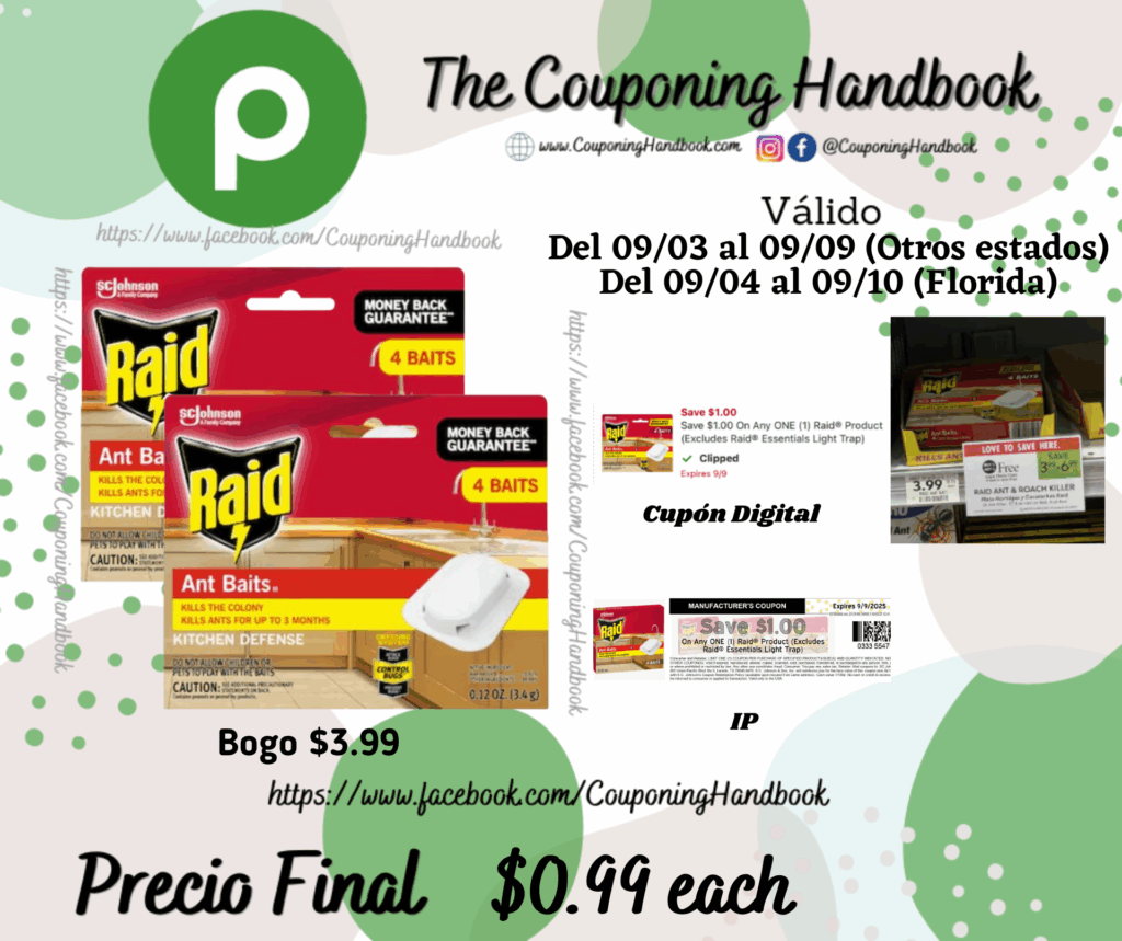 Compra 02 Raid Ant Baits Indoor Ant Killer – 0.12oz/4ct (Bogo $3.99), clipeamos el cupón digital de $1/1 any Raid® Product (Excludes Raid® Essentials Light Trap)….., también entregamos 01 IP de $1/1 any Raid product….., el cual lo puedes imprimir en el siguiente enlace