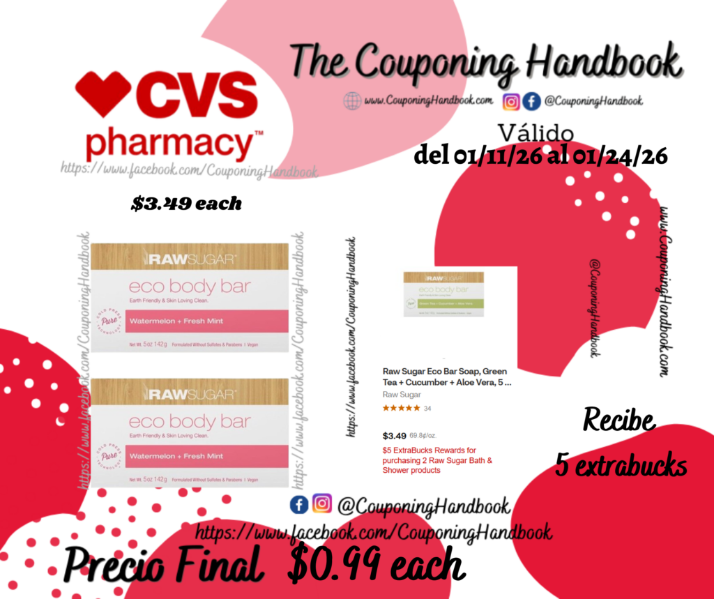 Compra 02 Raw Sugar Eco Bar Soap ($3.49 each)…..; pagaremos $6.98 por los 02 productos pero nos devolverán $5 Extrabucks, quedando la compra después de los extrabucks en $0.99 por cada producto.