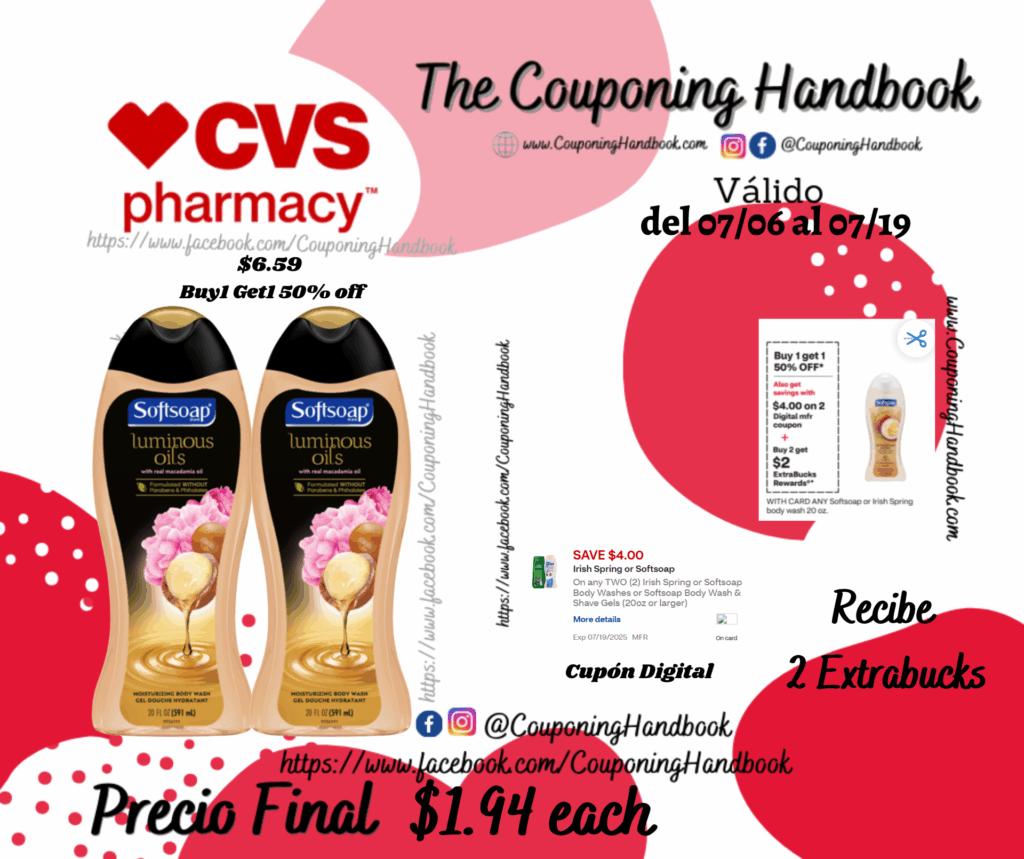 Compra 02 Softsoap Moisturizing Body Wash ($6.59 Buy1 Get1 50% off), clipeamos el cupón digital de $4/2 any Irish spring or softsoap body washes….; pagarás $5.88 pero te devolverán $2.00 Extrabucks, quedando tu compra en $1.94 por cada producto.