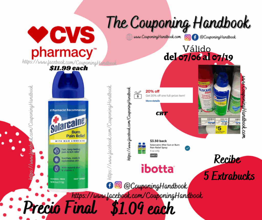 Compra 01 Solarcaine Burn Pain Relief Spray, 4.0 OZ ($11.99 each), clipeamos el CRT de 20% off one full price item….; pagaremos $9.59 por el producto pero nos devolverán $5 Extrabucks, quedándonos la compra por $4.59 el producto.