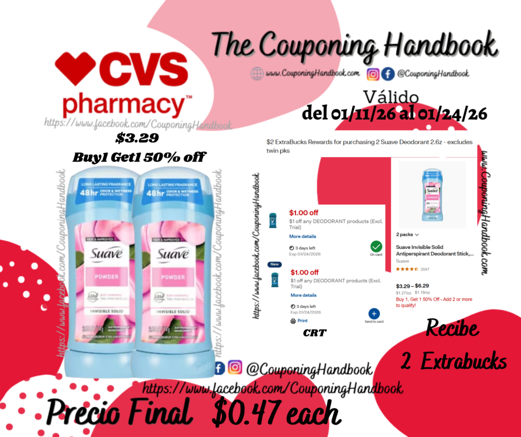 Compra 02 Suave Invisible Solid Antiperspirant Deodorant Stick, Powder, 1 Pack ($3.29 Buy1 Get1 50% Off), clipeamos los (02) CRT de $1 off any deodorant products……; pagaremos $2.94 pero te devolverán $2 Extrabucks por comprar 2 productos, quedando tu compra en $0.47 por cada producto.