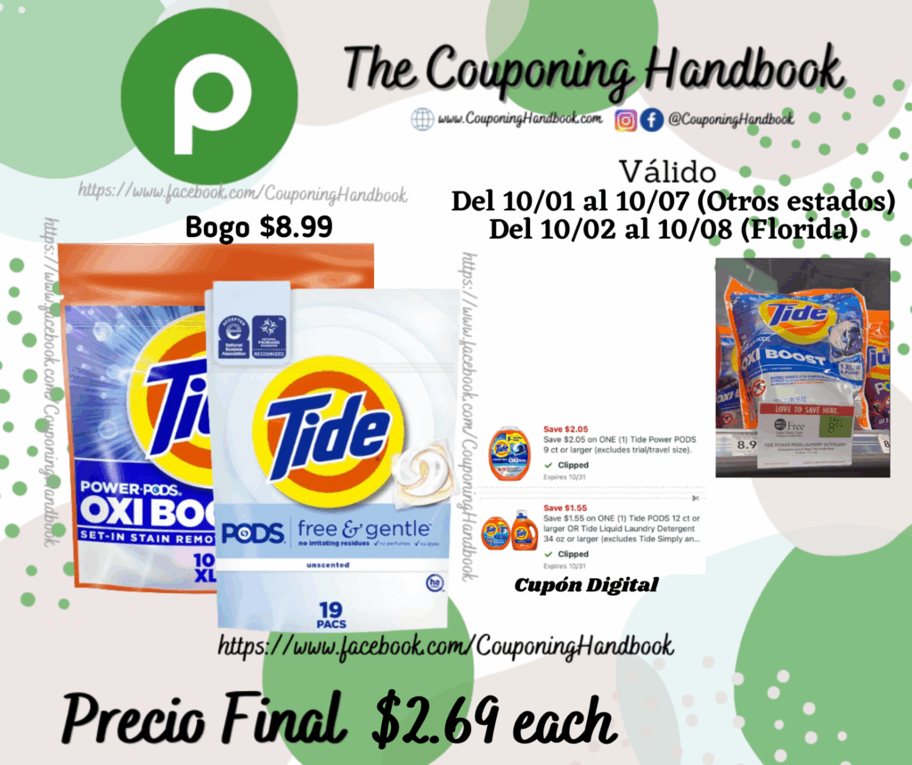 Compra 01 Tide Power Pods Laundry Detergent, Oxi Boost 10 ct Bag (Bogo $8.99) y 01 Tide PODS Free & Gentle Laundry Detergent Soap Pacs 19 ct (Bogo $8.99), clipeamos los cupones digitales de: $2.05/1 Tide Power PODS 9 ct or larger (excludes trial/travel size)…. y $1.55/1 Tide pods 12ct or larger or tide liquid laundry detergent 34oz or larger…..; Pagaremos $2.69 por cada producto.