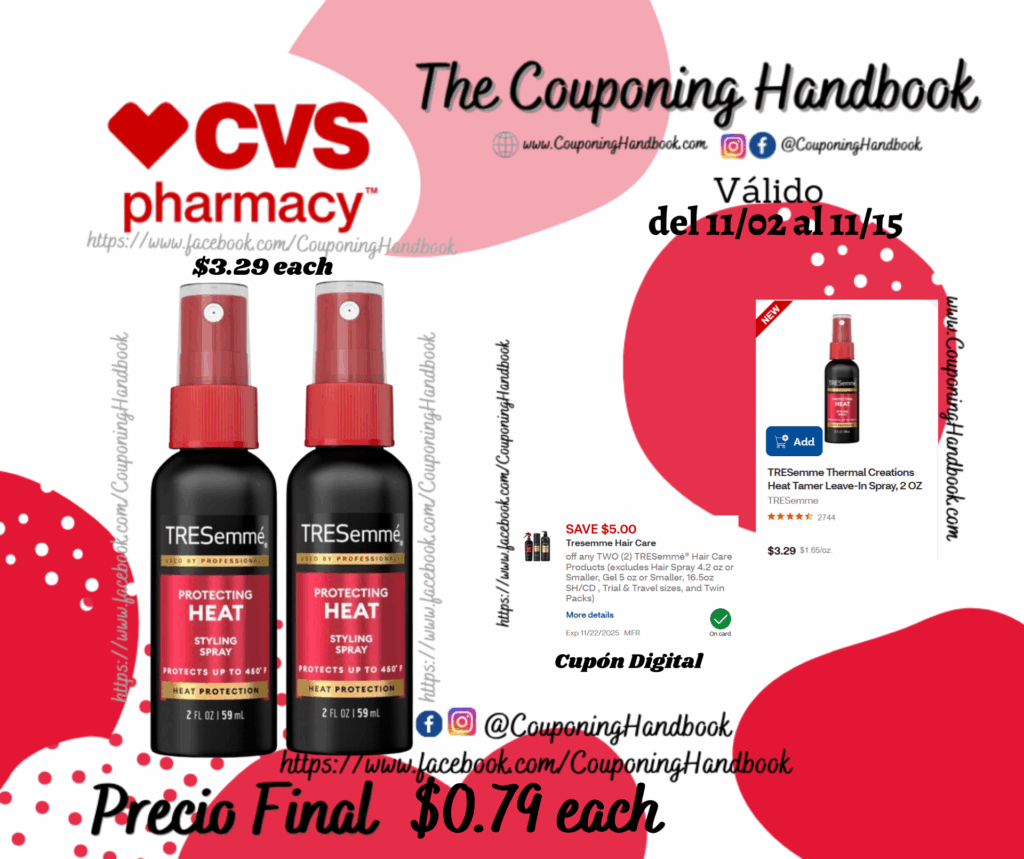 Toma 02 TRESemme Thermal Creations Heat Tamer Leave-In Spray, 2 OZ ($3.29 each), clipeamos el cupón digital de $5/2 any TRESemmé® Hair Care Products…..; Pagaremos $1.58 por los 02 productos o $0.79 por cada producto.