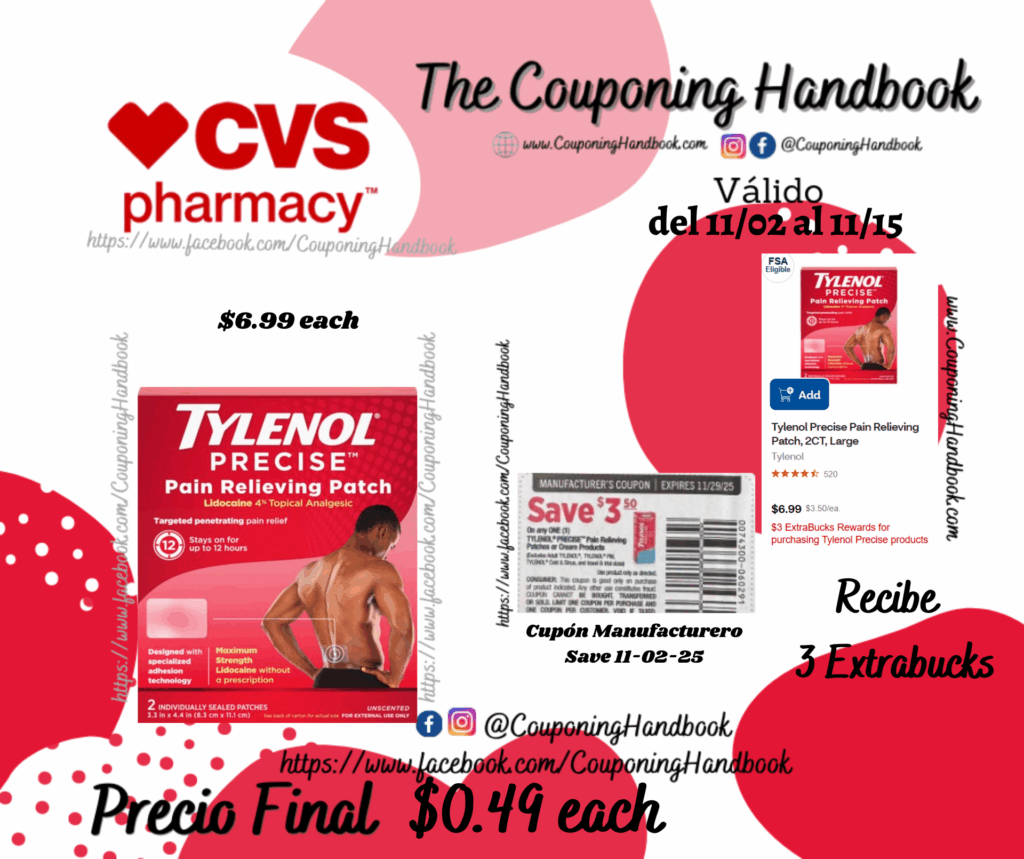 Toma 01 Tylenol Precise Pain Relieving Patch, 2CT, Large ($6.99 each), entregamos un cupón manufacturero del LIbro Save del 11/02/25 de $3.50/1 any tylenol precise pain relieving patches……; Pagaremos $3.49 por el producto pero nos devolverán $3 Extrabucks, quedando la compra después de los extrabucks en $0.49 por el producto.