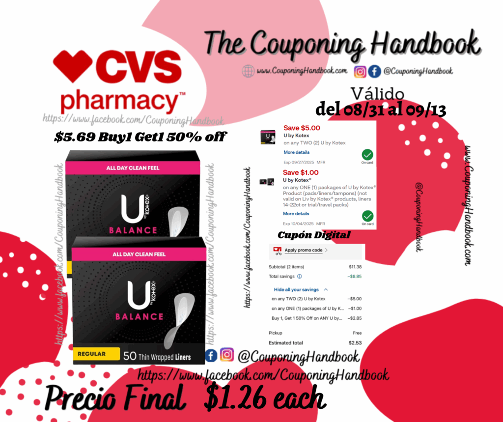 Toma 02 U by Kotex Balance Wrapped Panty Liners, Regular, 50 CT ($5.69 Buy1 Get1 50% off), clipeamos los cupones digitales de: $5/2 any U by Kotex…. y $1/1 any packages of U by Kotex® Product....; pagaremos $2.53 por los 02 productos o $1.26 por cada producto.