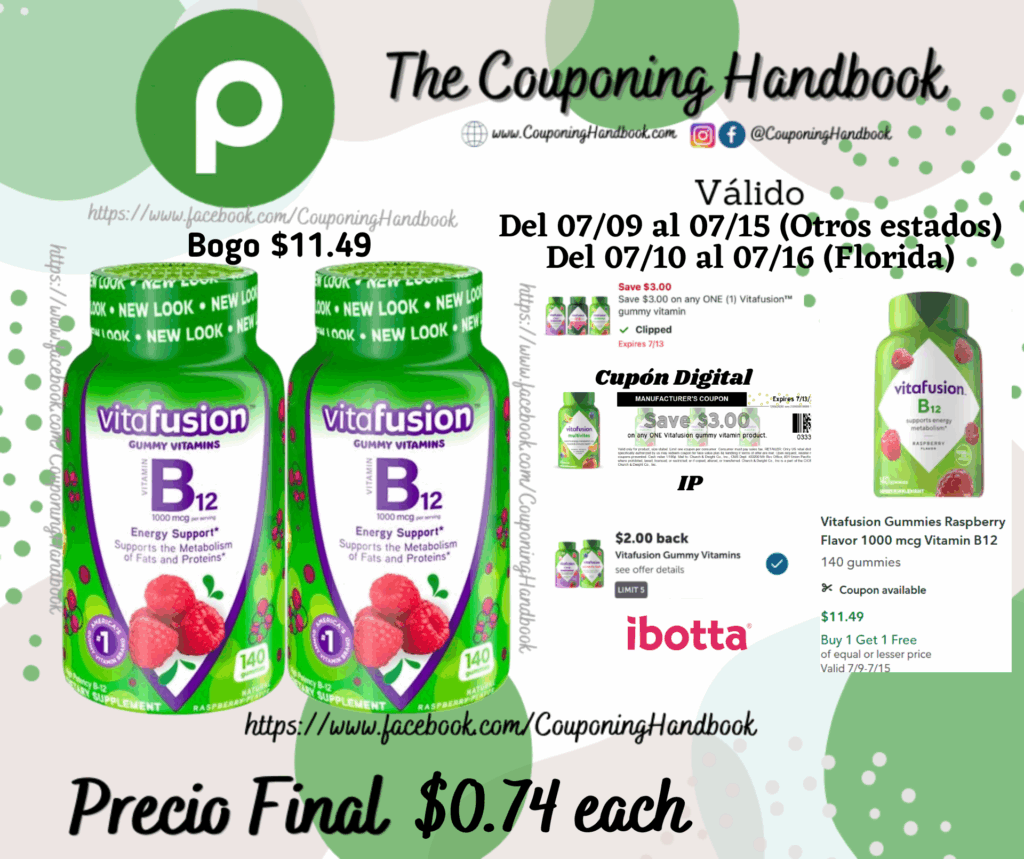 Compra 02 Vitafusion Gummies Raspberry Flavor 1000 mcg Vitamin B12 140 gummies (Bogo $11.49), clipeamos el cupón digital de $3/1 any Vitafusion™ gummy vitamin…, también entregamos 01 IP de $3/1 any Vitafusion™ gummy vitamin…., el cual lo puedes imprimir en el siguiente enlace